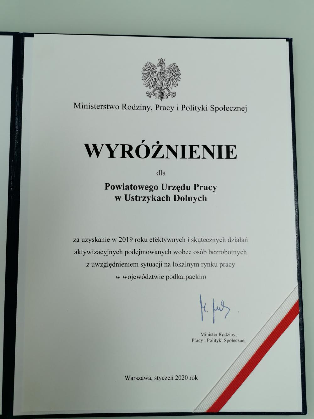 Wyróżnienie za zajęcie 2 miejsca w województwie podkarpackim za uzyskanie w 2019 r. efektywnych i skutecznych działań aktywizacyjnych podejmowanych wobec osób bezrobotnych dla Powiatowego Urzędu Pracy w Ustrzykach Dolnych odebrane przez Dyrektora PUP w Ustrzykach Dolnych Panią Katarzynę Przybyłę (29 stycznia 2020 r.)